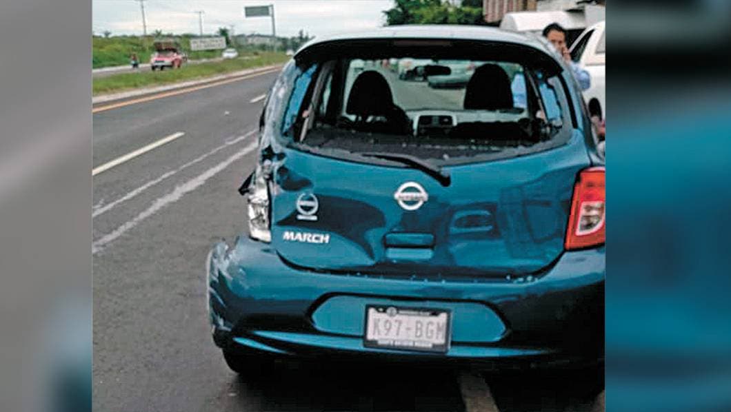 Un auto Nissan-March acabó con la cajuela y parte del costado izquierdo sumidos, tras ser impactado por una camioneta, cuando circulaban por el Libramiento Oriente, a la altura de la colonia Cuautlixco, de Cuautla.