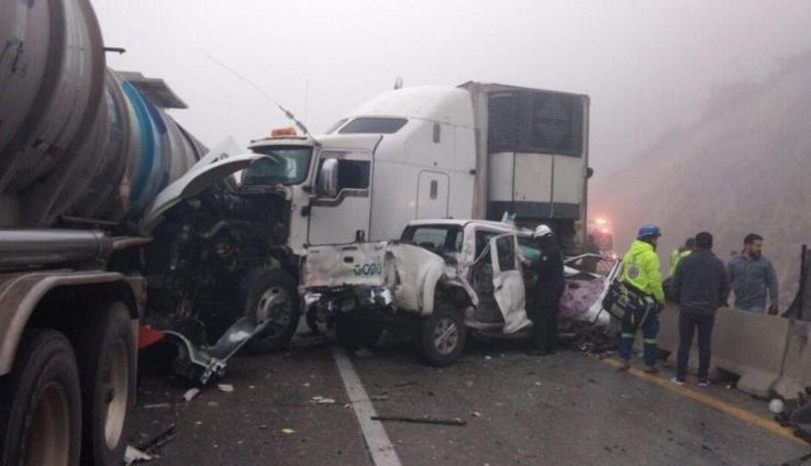 Autoridades de Protección Civil de Nuevo León reportan que el percance se debió a que un tráiler volcó y fue impactado por otro, mismo que impacta a 13 vehículos, esto aunado a la poca visibilidad, provoca el cierre de la vidalidad.