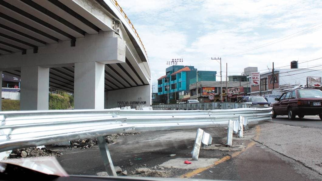 Pedazos de madera sirven de base a la barra de contencion colocada en el entronque del Polvorín, del Distribuidor Palmira, con destino al norte.