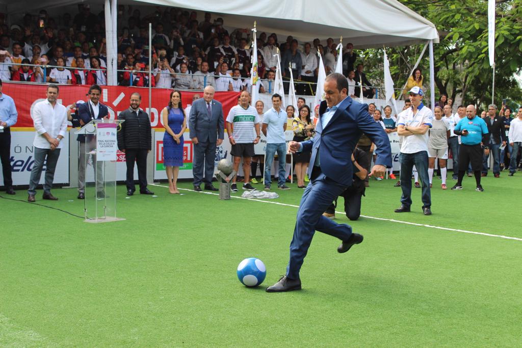 Así lo manifestaron el gobernador Cuauhtémoc Blanco Bravo y la presidenta del Sistema DIF estatal, Natália Rezende Moreira, al inaugurar la décimo primera edición del torneo nacional de futbol “De la Calle a la Cancha 2019”, que contará con la participación de 64 equipos de las ramas varonil y femenil de todo el país.