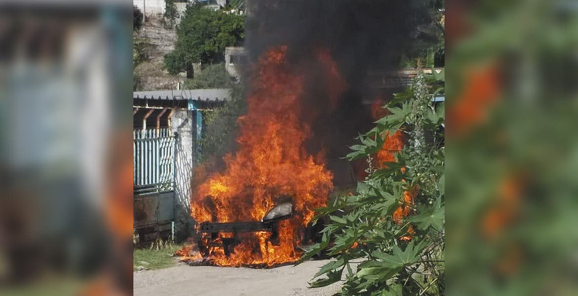 Ahí, poco antes antes de abordar su taxi nuevamente, al lugar llegó otro sujeto con un garrafón lleno de gasolina y comenzó a rociar el coche para luego incendiarlo, propagándose el fuego rápidamente hasta consumir el auto.