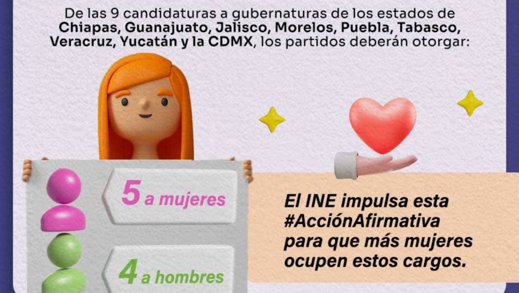 “Los PPN deberán postular al menos cinco mujeres en las nueve entidades donde se elige la gubernatura y la Jefatura de Gobierno de la Ciudad de México; lo anterior se considerará tanto para las candidaturas que postulen los partidos políticos en lo individual como en coalición o en candidatura común”, se establece en el ordenamiento avalado.