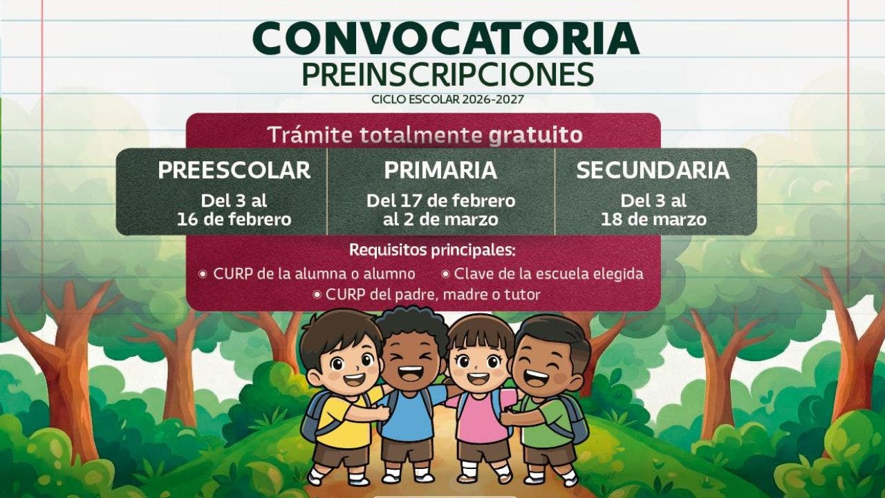 Del 17 de febrero al 2 de marzo se llevará a cabo el periodo de preinscripciones para Primer Grado de Primaria correspondiente al ciclo escolar 2026–2027, trámite dirigido únicamente a niñas y niños que ingresarán a este nivel educativo el próximo ciclo.