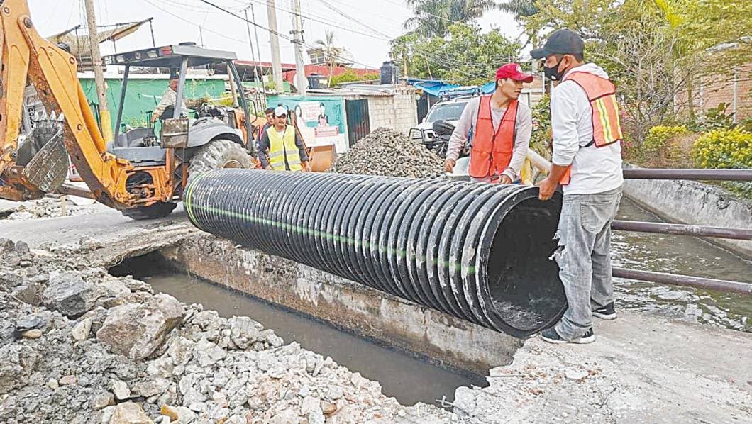 La Secretaría de Obras Públicas y Reconstrucción del municipio de Jojutla trabajan en puntos de riesgo de inundación durante la temporada de lluvias; en esta ocasión la brigada hizo trabajos de suministro e instalación de tubería para encausar el canal que se desbordaba a la altura de la Escuela Secundaria Benito Juárez.