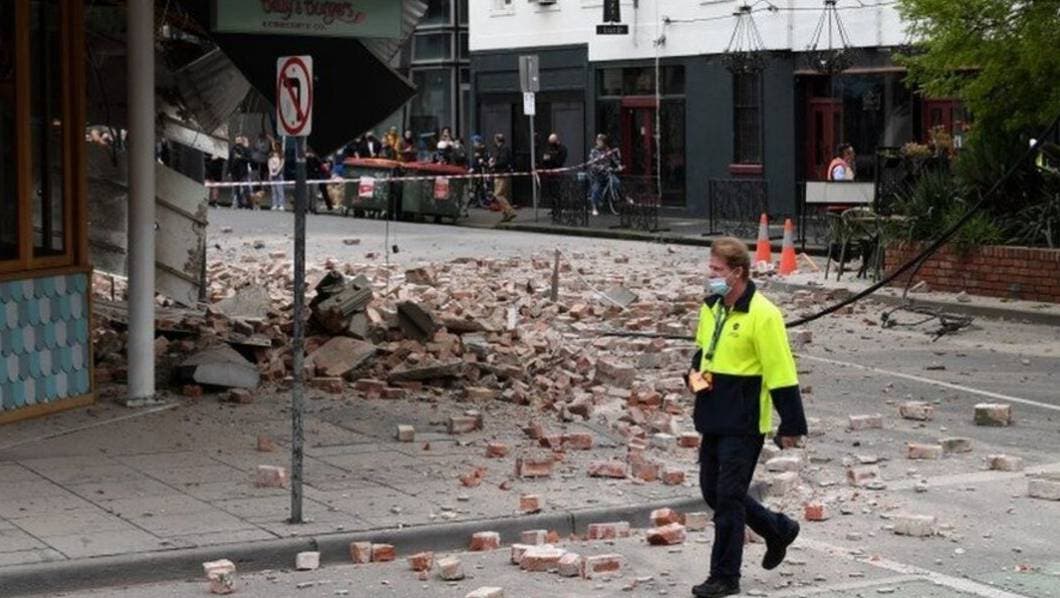 Imágenes en redes sociales mostraban escombros de lo que parecían ladrillos desprendidos de los edificios en una popular área comercial de Melbourne, Chapel Street.