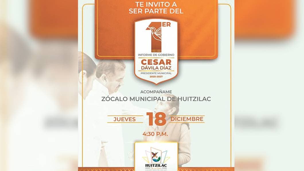 El presidente municipal de Huitzilac, César Dávila Díaz, hace una invitación a la ciudadanía al Primer Informe de Rendición de Cuentas, donde dará a conocer los avances, logros y resultados alcanzados durante el primer año de trabajo.