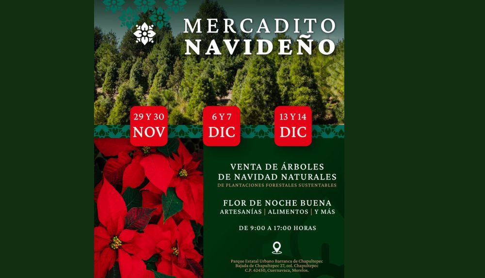 La Secretaría de Desarrollo Sustentable (SDS) invita a la ciudadanía a visitar el Mercadito Navideño, que se llevará a cabo los fines de semana: 29 y 30 de noviembre, 6 y 7 de diciembre, y 13 y 14 de diciembre, en el Parque Barranca de Chapultepec, de 09:00 a 17:00 horas.