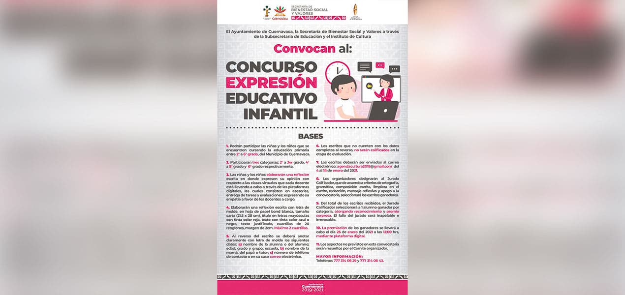 CUERNAVACA, MORELOS.- Con la finalidad de conocer la experiencia que han tenido los alumnos del municipio, respecto a las clases virtuales, el Ayuntamiento de Cuernavaca lanzó un concurso de expresión educativo infantil. La Secretaría de Bienestar Social y Valores a través de la Subsecretaría de Educación y el Instituto de Cultura informó de la convocatoria para participar en el concurso, la cual, concluirá el 18 de enero de 2021. La titular del sector educativo, Angélica Alejandre Valeriano informó que el concurso está dirigido a los estudiantes de nivel primaria, quienes podrán concursar por un premio sorpresa, y la intensión es que los alumnos tengan otros espacios para comunicarse, conocer su experiencia en la pandemia y en la toma de clases virtuales. La convocatoria se dividirá en tres categorías, segundo a tercer grado escolar, cuarto y quinto, y sexto de primaria. Las niñas y niños tendrán que elaborar una reflexión escrita. Los estudiantes tendrán que expresar su opinión con respecto a las clases virtuales que cada docente está llevando a cabo a través de las plataformas digitales, las cuales, consisten en asesoría, entrega de tareas y evaluaciones. La subsecretaria de educación de Cuernavaca señaló que en este ejercicio, los alumnos de primaria, también podrán expresar su empatía a favor de los docentes, su experiencia y su aprendizaje a través de estas plataformas digitales. La reflexión tendrá que ser escrita con letra de molde en hoja de papel bond blanca tamaño carta, el título de la participación con letras mayúsculas con tinta roja, texto con tinta azul, y máximo dos cuadrillas. Al reverso del escrito se deberá anotar claramente con letra de molde los datos de la alumna o alumno, edad, grado, escuela, nombre de la mamá, papá o tutor, número telefónico de contacto o en su caso correo electrónico. Los escritos que no cuenten con los datos completos al reverso, no serán calificados en la etapa de evaluación y enviados al correo agendacultural2019@gmail.com.