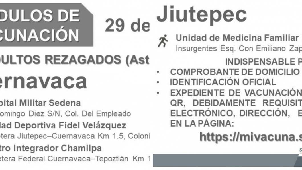 En Jiutepec, la aplicación de dosis de AstraZeneca para personas rezagadas se desarrollará este viernes 29 de octubre a partir de las 9:00 a.m. y hasta concluir las dosis asignadas en el Punto de Vacunación. Las sede se ubicará en: