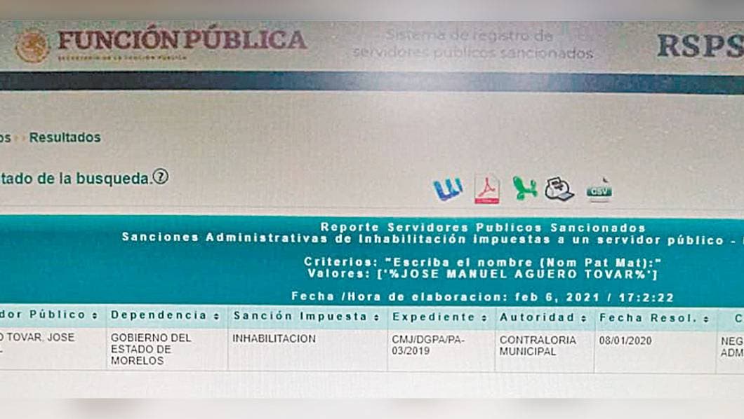 CUERNAVACA, MORELOS.- De acuerdo con la Secretaría de la Función Pública, el ex alcalde del municipio de Jiutepec, José Manuel Agüero Tovar, estaría inhabilitado para ocupar un nuevo cargo en la administración pública.