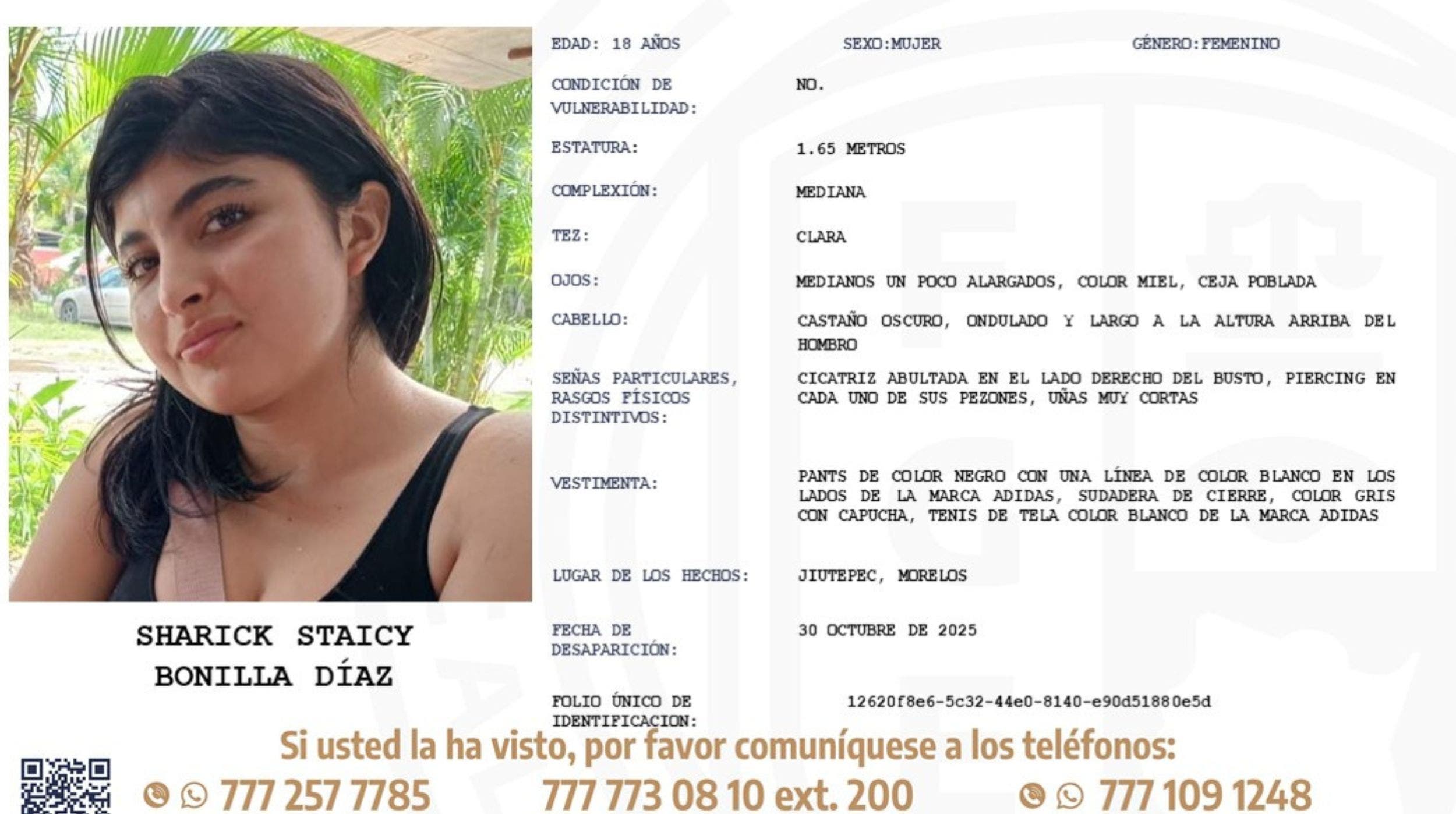 La ficha de búsqueda emitida por la Fiscalía describe a Sharick con precisión y urge a la población a reportar cualquier avistamiento.