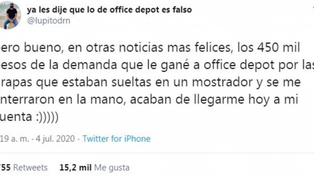 Pues resulta que el joven escribió que le había ganado 450 mil pesos en una demanda a una gran empresa de papelería, mejor conocida cómo Office Depot, ¿Qué pasó después? Bueno que todos, incluyendo a la misma empresa, le creyeron.