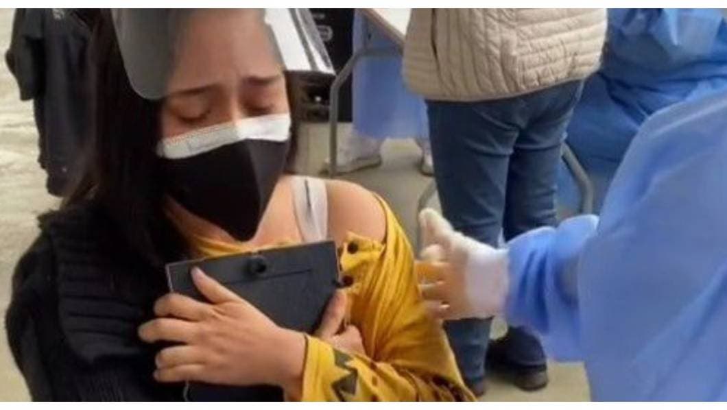 Después de recibir la dosis, la joven abraza la foto y comiena a llorar, mientras recibe unas palabras de aliento de la persona que la inmunizó.