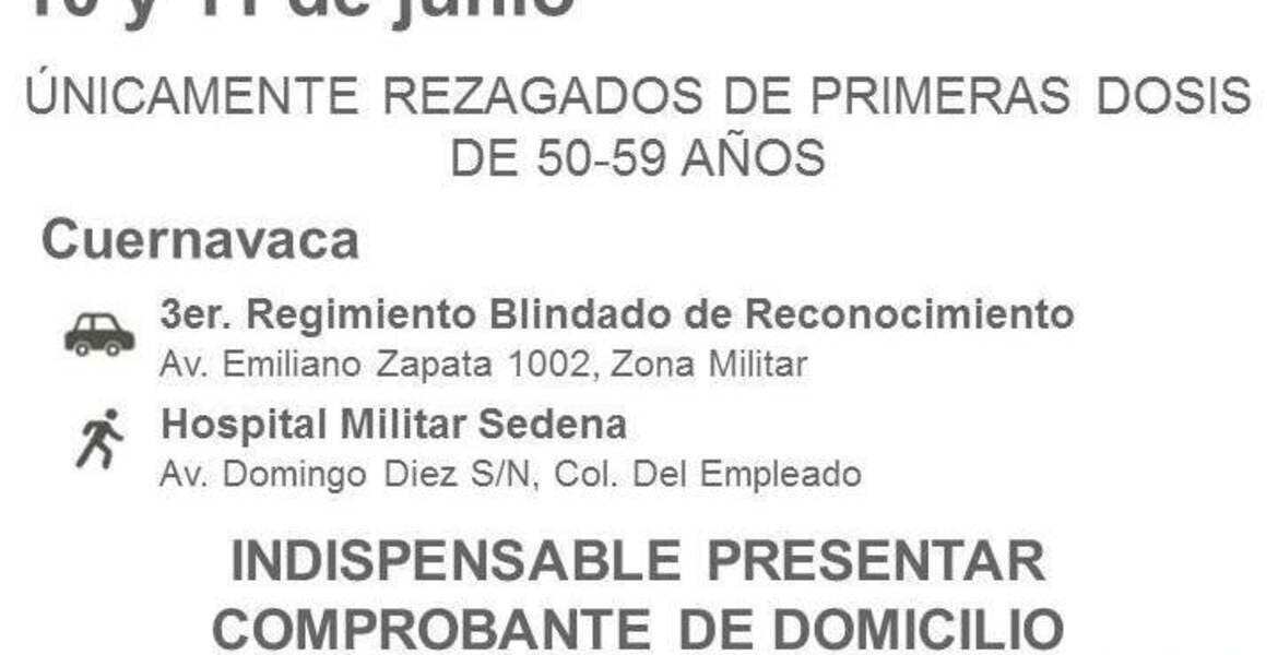 La Brigada Correcaminos en Morelos informa que en el municipio de Cuernavaca este jueves 10 y viernes 11 de junio se inmunizará con la primera dosis a la población rezagada de 50 a 59 años con la vacuna Pfizer BioNTech; será únicamente para quienes comprueben su residencia en este municipio. Los puntos de vacunación se ubicarán en: