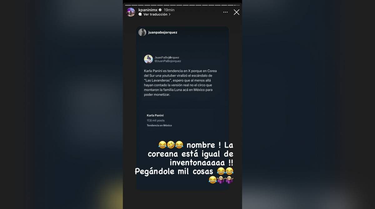 En una historia de Instagram, Karla Panini citó un comentario de twitter donde un usuario menciona que la versión de Stephanie Soo sea la “real” y no la historia que la familia de Karla Luna “montó para monetizar” a lo que la ex lavandera dijo: “Nombre, la coreana está igual de inventonaaaaa”.