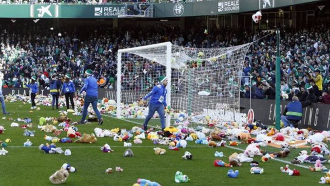 Cuando un equipo de fútbol consigue una victoria importante, a veces se produce una invasión de campo. Los aficionados entran en masa en el terreno de juego para abrazar a los jugadores. Este sábado, en el descanso del Betis-Eibar, la invasión del Benito Villamarín ha sido de peluches. Y con un objetivo solidario.
