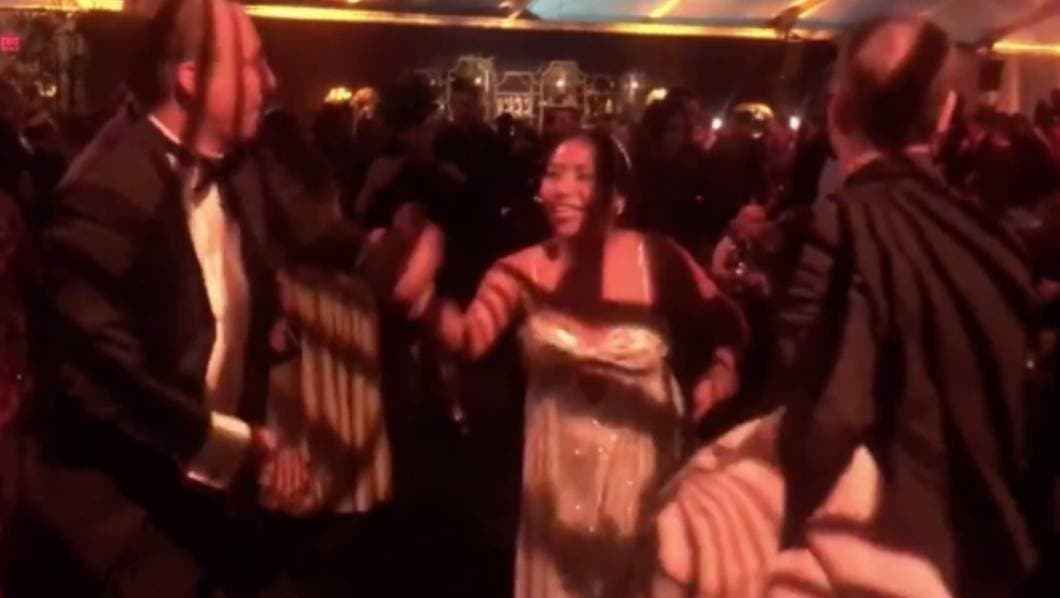 Un video difundido por la periodista Yvonne Villarreal en su cuenta de Twitter da cuenta de los pasos de Aparicio, quien disfrutó de una buena cumbia en compañía de un sujeto en esmoquin.