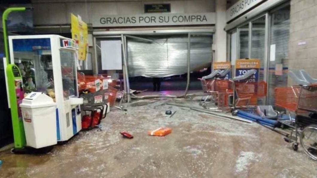 Una grabación captada por cámaras de seguridad del supermercado cerca de las 3:40 horas muestra el momento en el que sujetos a bordo de una camioneta entraron al local rompiendo la puerta de acceso a la tienda, ubicada en la avenida Ozumbilla, en los Héroes Tecámac.