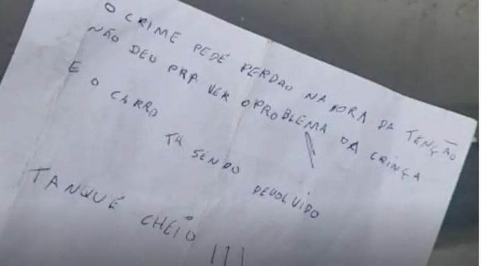“El crimen pide perdón. En el momento de la tensión no pude ver el problema del niño. El auto está siendo devuelto. ¡¡¡Tanque lleno!!!”, decía el papel escrito a puño y letra del criminal.
