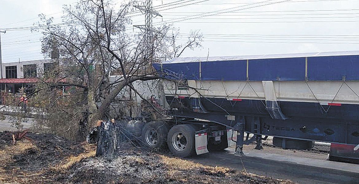 Un tráiler doble remolque fue aplastado por un árbol, tras desplomarse presuntamente luego de que le prendieran fuego en un camellón, justo en el libramiento Oriente, a la altura de las vías de la empresa Campi, en la colonia Cerritos, en Cuautla.