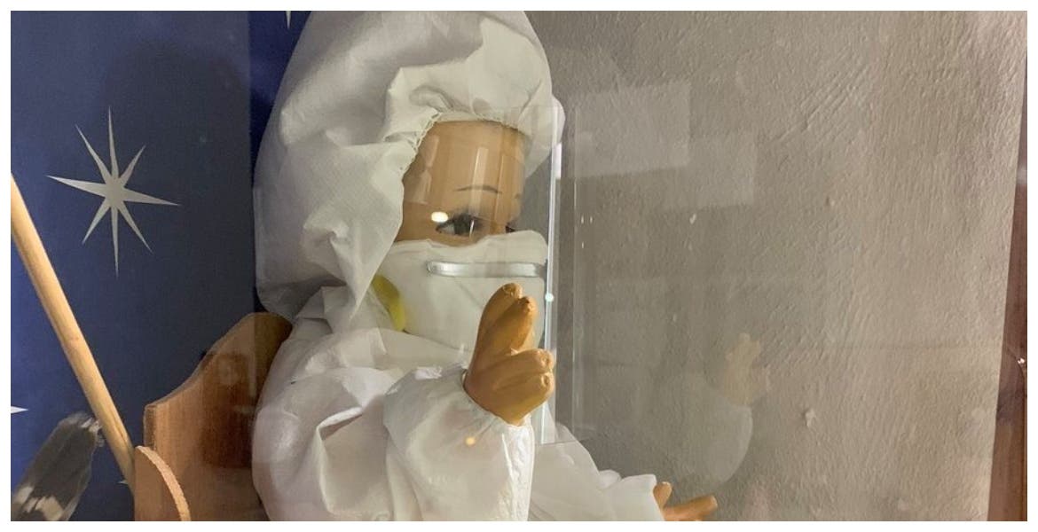 La pandemia de Covid-19 ha modificado prácticamente todos los aspectos de la vida cotidiana, incluyendo las figuras religiosas. Ejemplo de ello es la imagen que circula en redes sociales del 'Niño Doctor' actualizado, portando cubrebocas, careta y un traje de proteccion personal anti coronavirus.
