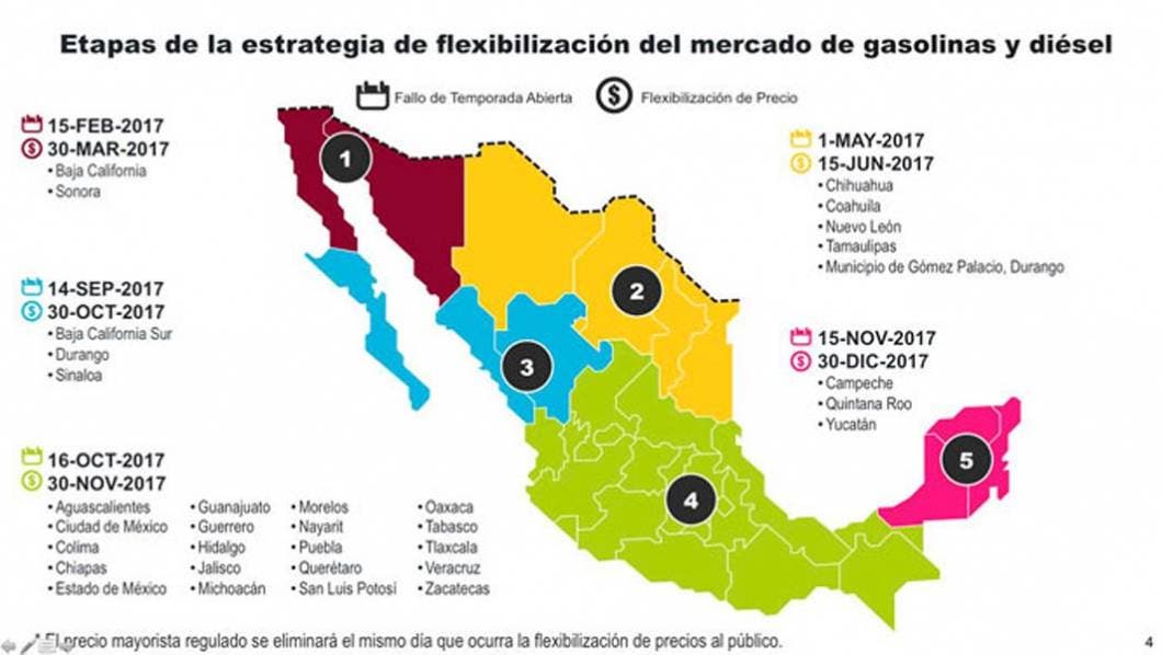 La liberalización del precio de las gasolinas y el diésel se aplicará de forma gradual y ordenada, para lo cual la autoridad definió cinco zonas geográficas: tres en el norte, una en el centro y otra más al sur del país.