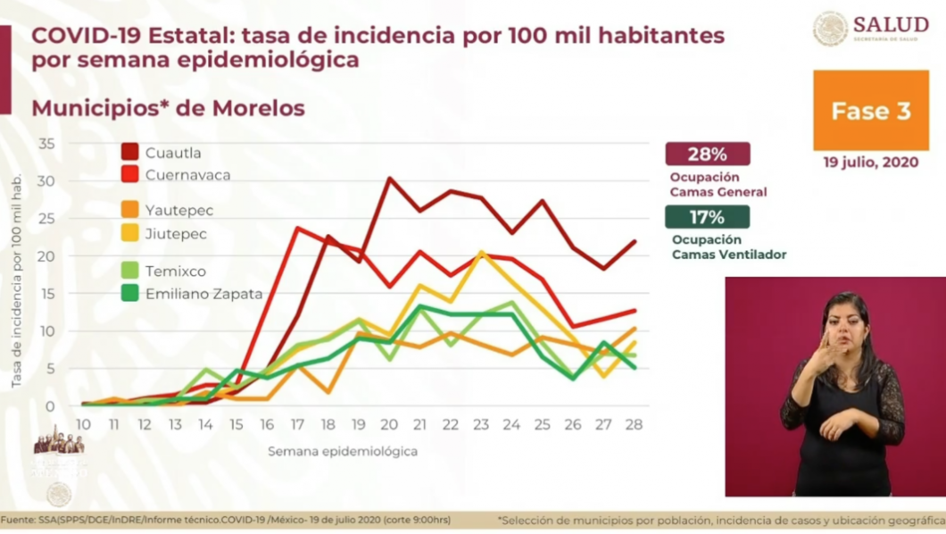 En la conferencia de prensa de las 19:00 horas, se dijo que Morelos presenta un ligero ascenso en el número de casos, en especial en la semana 28, con un comportamiento ondulante en los casos confirmados.