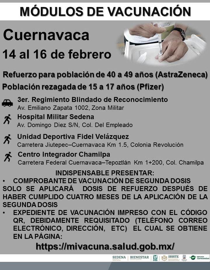 La vacunación se realizará del 14 al 16 de febrero en Cuernavaca y Xochitepec, será refuerzo AstraZeneca para adultos de 40 a 49 años y para jóvenes rezagados de 15 a 17 años a quienes se les aplicara el biológico Pfizer.