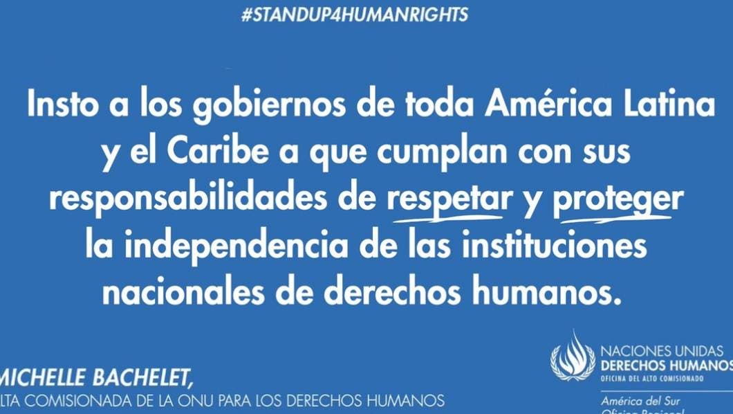 La Alta Comisionada de las Naciones Unidas para los Derechos Humanos, Michelle Bachelet, dio la voz de alarma el jueves por el creciente número de amenazas, ataques e intentos de socavar y deslegitimar las instituciones nacionales de derechos humanos (INDH) independientes en América Latina y el Caribe, por parte de gobiernos y otras personas en posiciones de poder.
