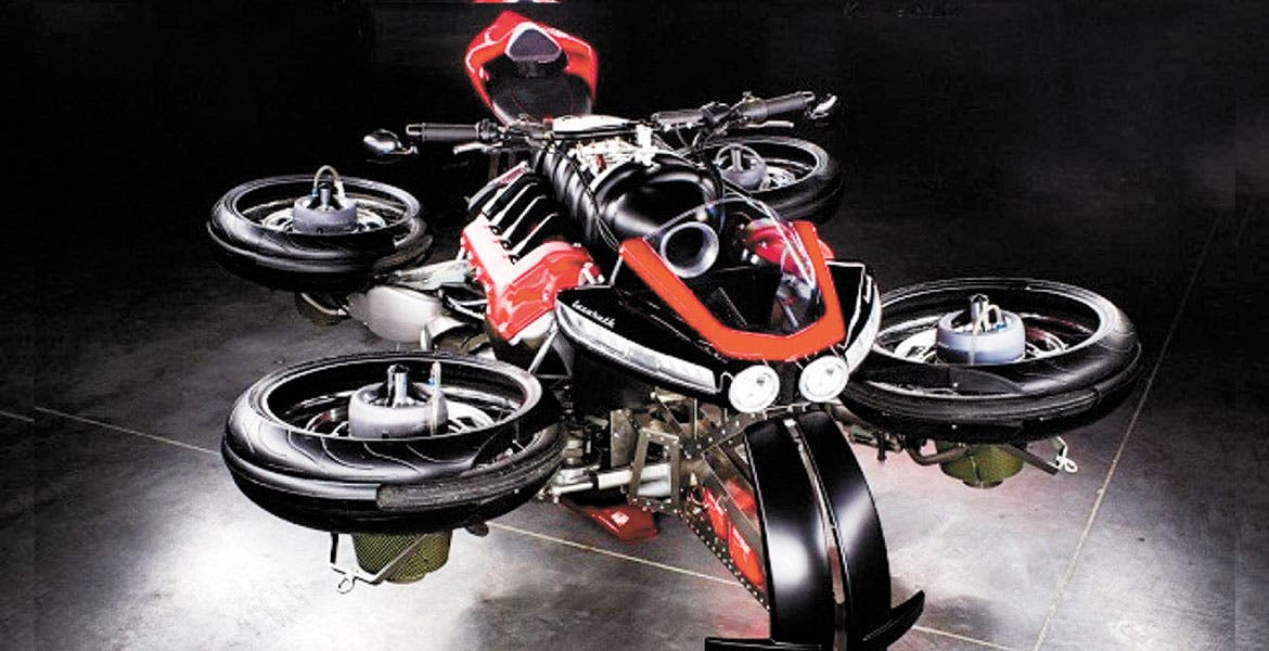 Esta fantasía de cuatro ruedas es el resultado de la obsesión del ingeniero mecánico Ludovic Lazareth, que investiga desde la década de los 90 la manera de propulsar las motos para hacerlas volar. “Quería ser pionero en la industria”.