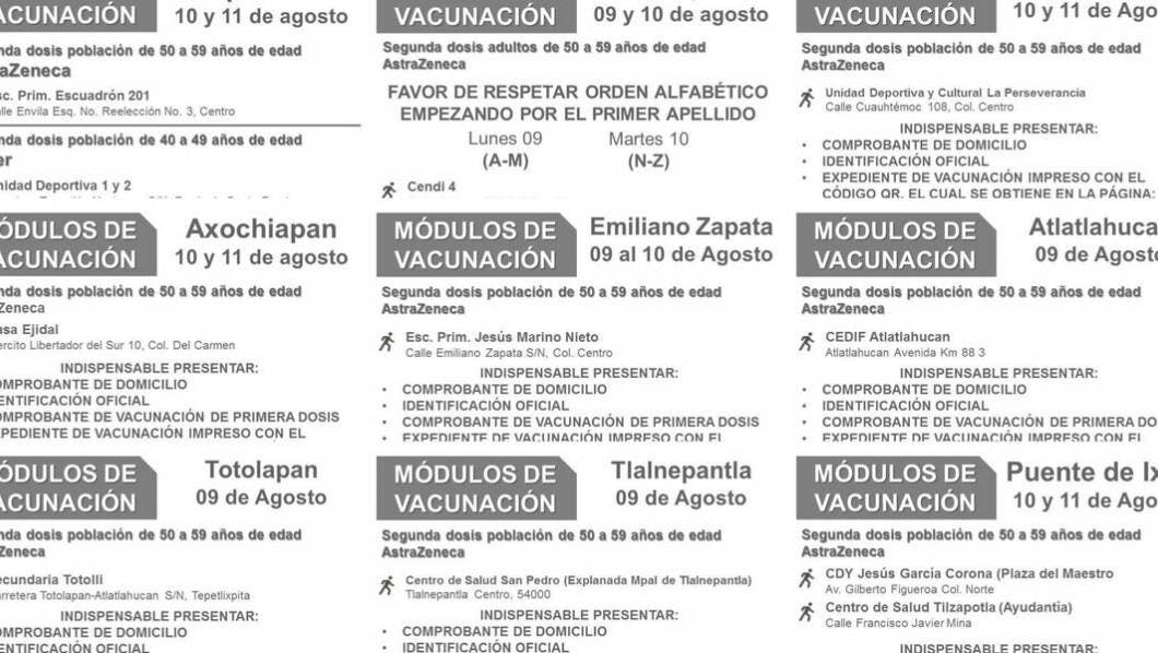 En Jiutepec, la aplicación de las segundas dosis de la vacuna AstraZeneca para personas de 50 a 59 años se realizará el 9 y 10 de agosto a partir de las 9:00 a.m. y hasta concluir las dosis asignadas en las sedes que se ubicarán en:
