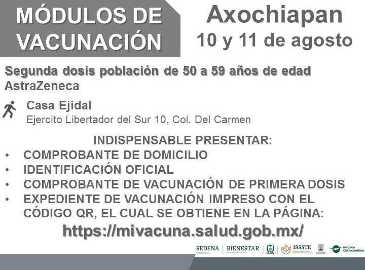 Finalmente, en el municipio de Axochiapan los días 10 y 11 se aplicará la segunda dosis de vacuna AztraZeneca a la población de 50 a 59 de edad a partir de las 9.00 a.m. en la sede: