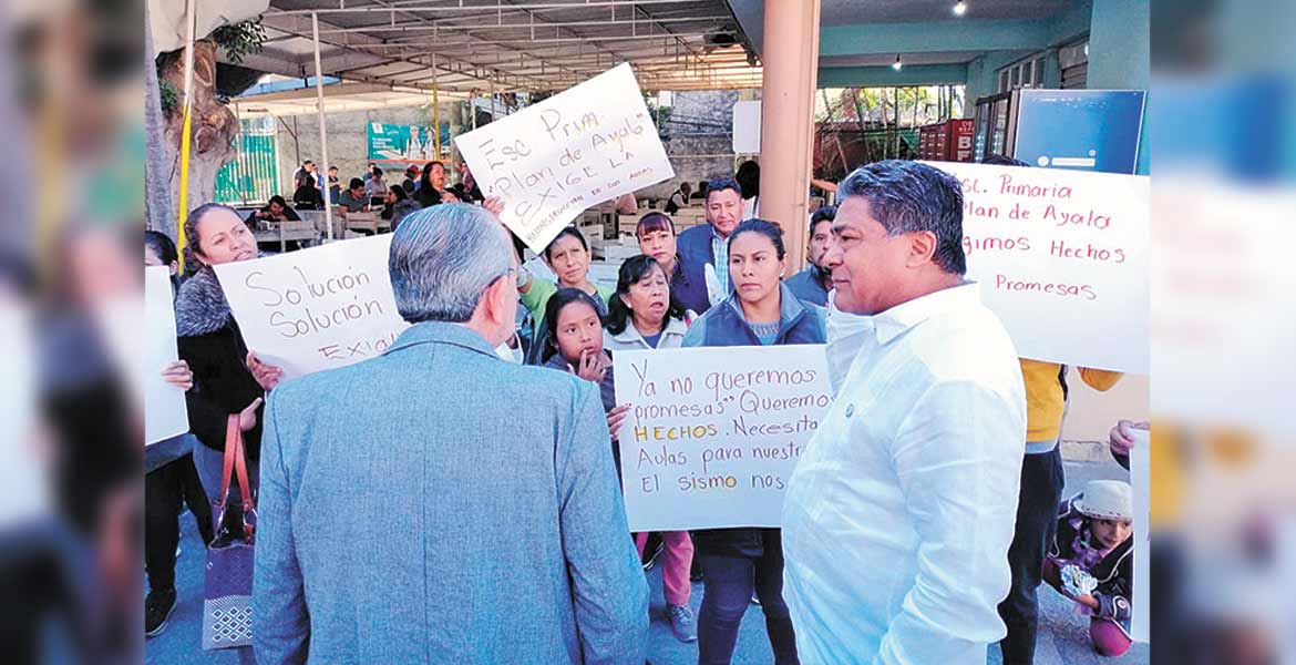 Cerca de las 10:00 horas, arribó un grupo de padres de familia de la Escuela Primaria ‘Plan de Ayala’, de Tlaquiltenango, para pedir que fueran tomados en cuenta con la reconstrucción de tres aulas, que resultaron afectadas desde 2017 por el sismo.