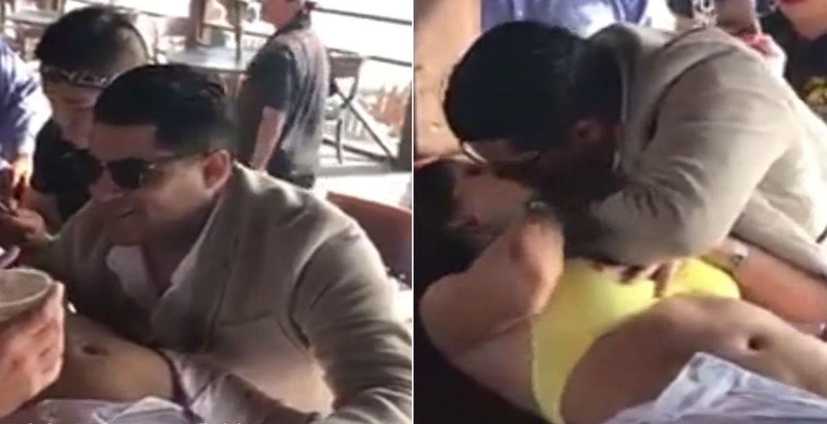 Finalmente, el servidor público sostiene a la mujer por la cabeza para besarla por la fuerza, a lo que la mujer responde alejándolo y sonriendo mientras se levanta y se va de la mesa.