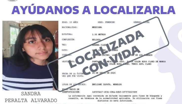 En una noticia que genera alivio inmediato para la familia y la comunidad de Morelos, la Fiscalía General del Estado de Morelos informó este sábado que la Fiscalía Especializada en Desaparición Forzada de Personas localizó con vida a Sandra Peralta Alvarado, la menor de 15 años que se había ausentado voluntariamente de su domicilio en la colonia Las Cumbres de Emiliano Zapata. No fue víctima de ningún delito.