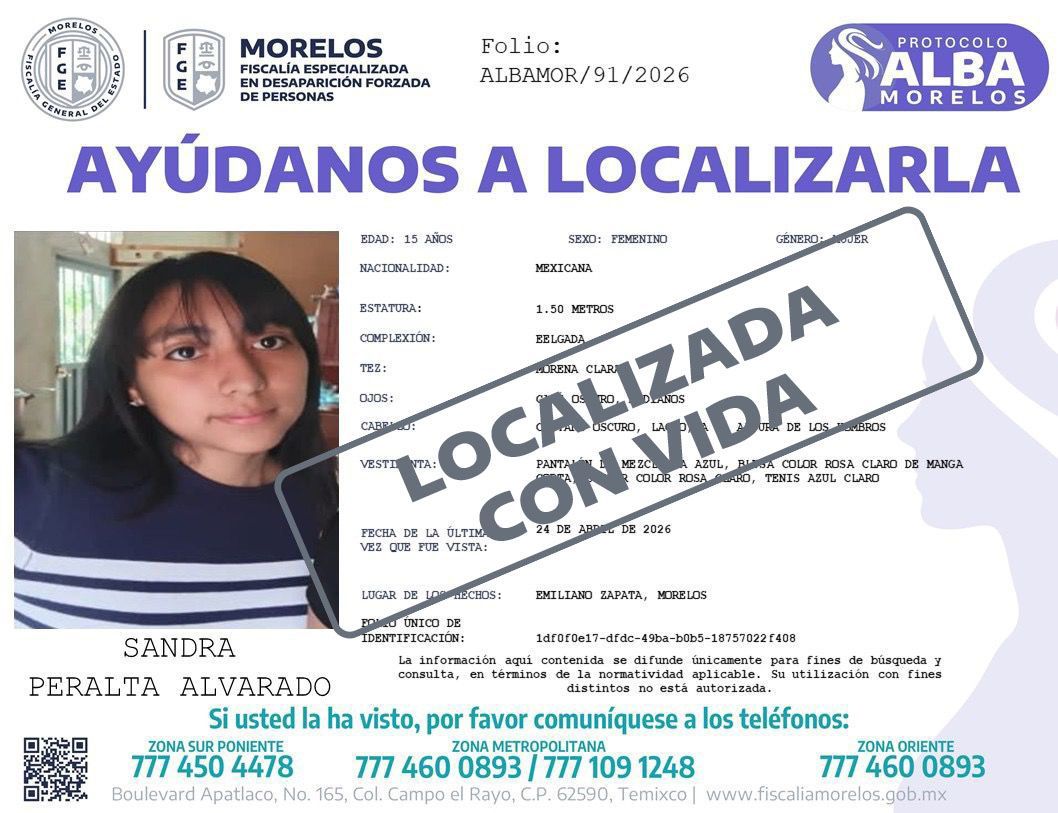 En una noticia que genera alivio inmediato para la familia y la comunidad de Morelos, la Fiscalía General del Estado de Morelos informó este sábado que la Fiscalía Especializada en Desaparición Forzada de Personas localizó con vida a Sandra Peralta Alvarado, la menor de 15 años que se había ausentado voluntariamente de su domicilio en la colonia Las Cumbres de Emiliano Zapata. No fue víctima de ningún delito.