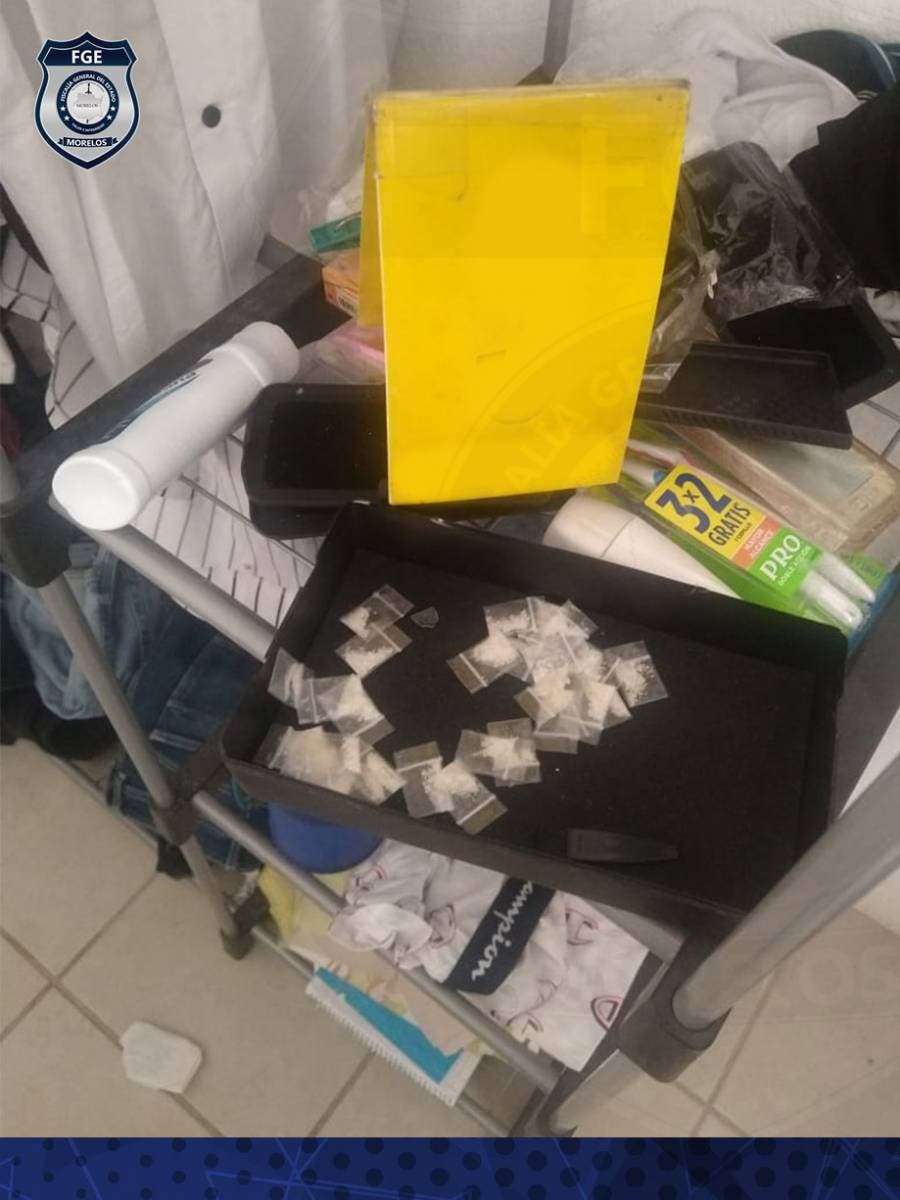 Previo a la ejecución del cateo, en un recorrido de seguridad realizado por agentes de la Policía Morelos en las inmediaciones del fraccionamiento Villa Teques Aqua, se detuvo a Juan David “N” y Andrés “N”, ambos originarios de la República de Colombia, quienes al percatarse de la presencia de los agentes intentaron amedrentarlos para que se retiraran, pero fueron detenidos; entre su ropa se les hallaron envoltorios con sustancia sólida similar a la droga cristal, por lo que fueron llevados ante el Ministerio Público (MP).