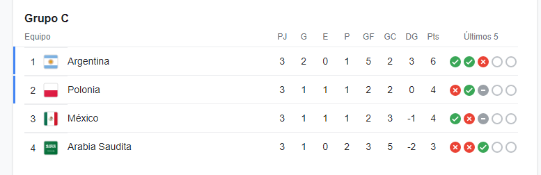 Más allá de la victoria, para clasificar México también necesitaba que la albiceleste perdiera contra Polonia, algo que no sucedió, por lo que terminó tercero en su llave, detrás del equipo de Lewandowski, que avanzó a octavos como segundo. El equipo de Renard finalizó último con tres unidades.