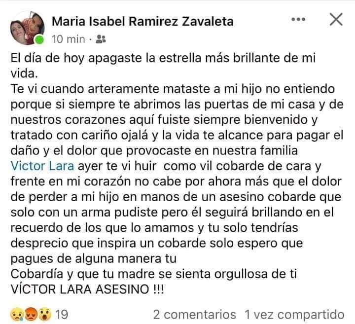 Finalmente, la mujer reveló el nombre del agresor de su hijo en la publicación compartida en su cuenta de Facebook: “Víctor Lara ayer te vi huir como vil cobarde, de cara y frente, en mi corazón no cabe por ahora más que el dolor de perder a mi hijo en manos de un asesino cobarde, que solo con un arma pudiste, pero él seguirá brillando en el recuerdo de los que te amamos, y tú sólo tendrás el desprecio que inspira un cobarde. Sólo espero que pagues de alguna manera tu cobardía y que tu madre se sienta orgullosa de ti. Víctor Lara, asesino”.