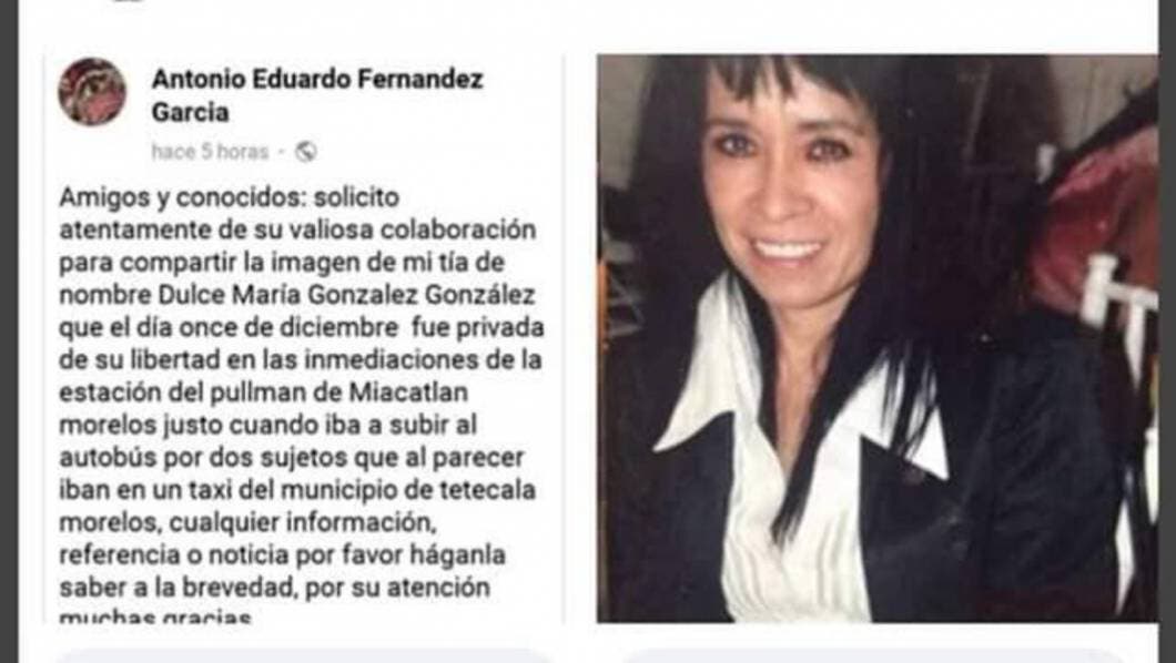 La profesora de educación preescolar Dulce María González González, fue localizada sin vida en el municipio de Ocuilan de Arteaga, Estado de México, después de ser reportada como desaparecida desde el 11 de diciembre, en Miacatlán.