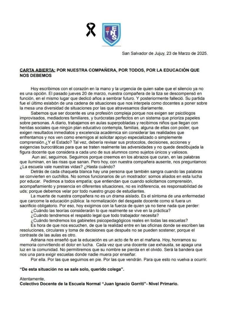 Adriana Silvia Armella tenía 56 años, estaba casada y era madre de cuatro hijos. Sus restos fueron sepultados en un cementerio de San Salvador de Jujuy. Su muerte ha encendido una alarma internacional sobre las condiciones laborales del magisterio, haciendo eco en millas de educadores que hoy levantan la voz por respeto, empatía y dignidad.