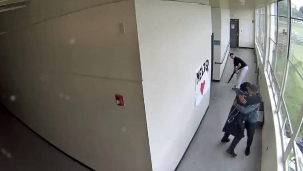 El aterrador momento ocurrió el 17 de mayo en Parkrose High School, una escuela preparatoria de Portland. El video muestra a Keanon Lowe abrazando al estudiante mientras le pasa el rifle a otro maestro. El incidente no tuvo víctimas.
