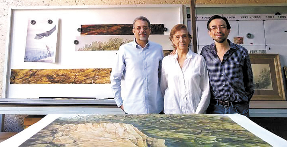 Familia. Minda, esposa de Jorge Cázares, y sus hijos Jorge y César, en el taller del paisajista donde hay una réplica del mural de José María Morelos y Pavón (2005) que adorna el Palacio de Gobierno.