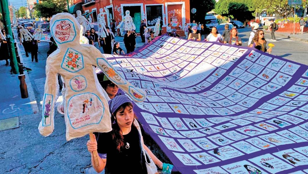 La movilización inició en la iglesia de El Calvario, acompañada por el ensamble de percusión Wamazo 8M. Las participantes recorrieron calles como Matamoros y General Galeana, portando pancartas, muñecos de tela y la manta de la colectiva “Las nombramos bordando”, que muestra los rostros de mujeres asesinadas por violencia feminicida.