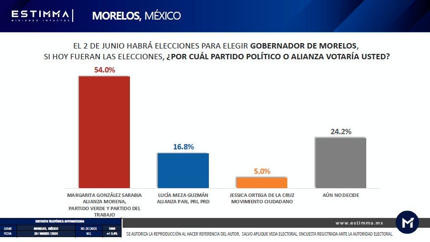 González Saravia está más de 37 puntos arriba que la candidata de la alianza PAN-PRI-PRD, Lucía Meza. Muy por debajo y con apenas 5.0% de las preferencias, aparece la candidata de Movimiento Ciudadano a la gubernatura en Morelos, Jessica Ortega.