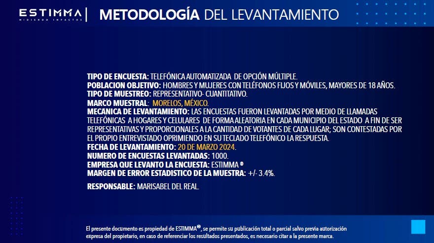 Estimma, empresa mexicana especializada en la realización de encuestas de estudios de opinión pública, cuestionó a hombres y mujeres mayores de 18 años por medio de llamadas telefónicas acerca de sus preferencias electorales rumbo a una jornada histórica en la que, por primera vez, una mujer gobernará Morelos.