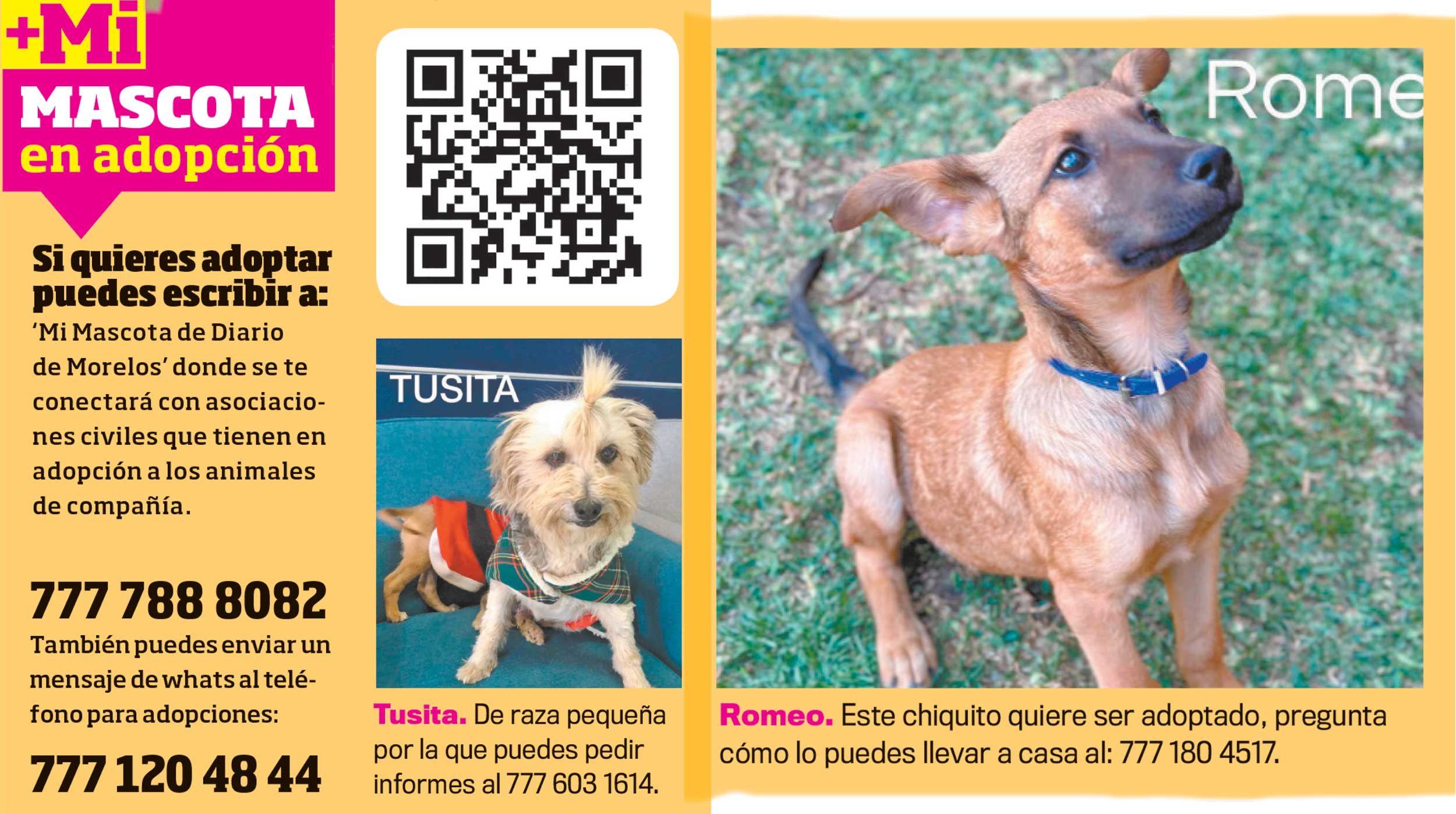 Si quieres adoptar puedes escribir a: ‘Mi Mascota de Diario de Morelos’ donde se te conectará con asociaciones civiles que tienen en adopción a los animales de compañía.