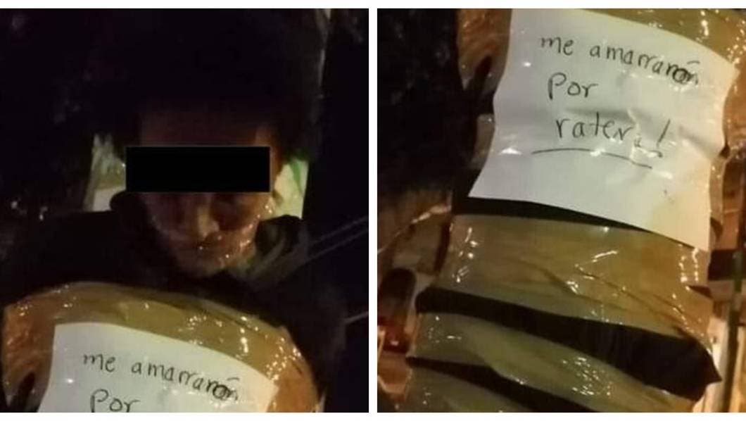 La mujer fue atada con cinta canela y traía un papel pegado que decía "Me amarraron por ratera".
