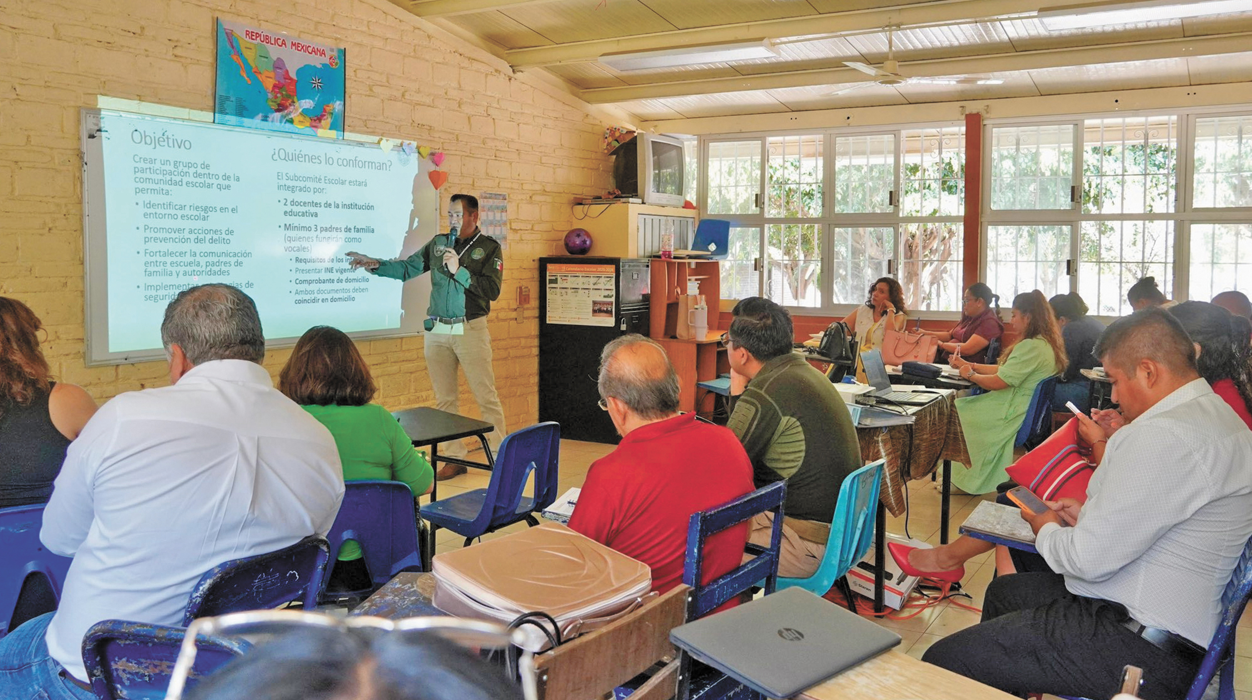 El secretario de Seguridad Pública y Tránsito Municipal, Rogelio Romero Nente, y el director de Prevención del Delito, Julio Sebastián Meraz García, explicaron a la supervisora Claudia Navarrete y a directores escolares la implementación de Marchas Exploratorias de Seguridad y la vinculación de cámaras al sistema C2.