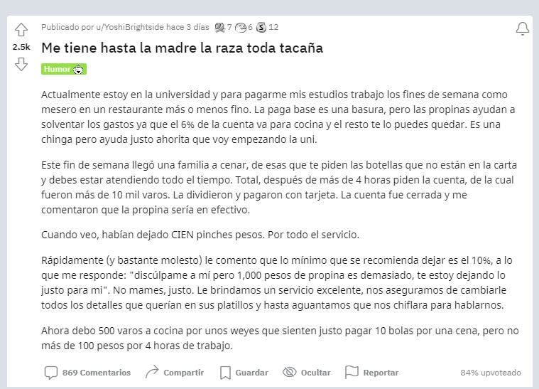 Un joven que estudia la Universidad y trabaja en un restaurante durante fines de semana como mesero, decidió compartir una pequeña anécdota en la plataforma de Reddit, donde indicó que ya estaba harto de la “raza tacaña”, ya que el trabaja para poder solventar su Universidad.
